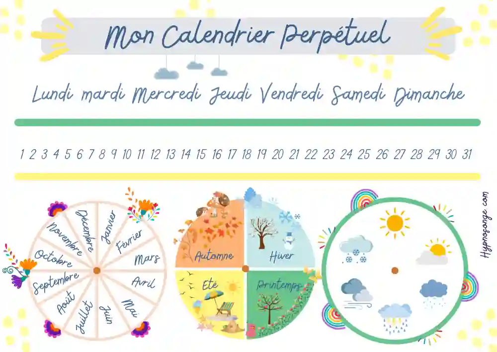 Pour utiliser le calendrier perpétuel, découpez les trois flèches et fixez-les au centre des différentes roues (les 12 mois, les saisons, et la météo) à l’aide d’attaches parisiennes. Votre enfant pourra ainsi faire tourner les flèches pour indiquer les éléments correspondants. Pour les jours et les dates de la semaine, vous aurez besoin d’une petite ficelle et d’une perle. Passez la ficelle avec la perle le long de la ligne, en faisant un trou de chaque côté, puis attachez-la avec un petit nœud à l’arrière pour maintenir la ficelle en place. Votre enfant pourra ensuite déplacer la perle le long du fil au gré des jours et des dates.