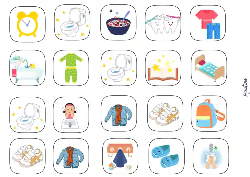 Pour les routines, découpez simplement les pictogrammes « routine » dont vous avez besoin et fixez-les sur vos affiches de routine à l’aide de petits scratchs autocollants. Votre enfant pourra ainsi les déplacer au fur et à mesure qu’il progresse dans sa routine.