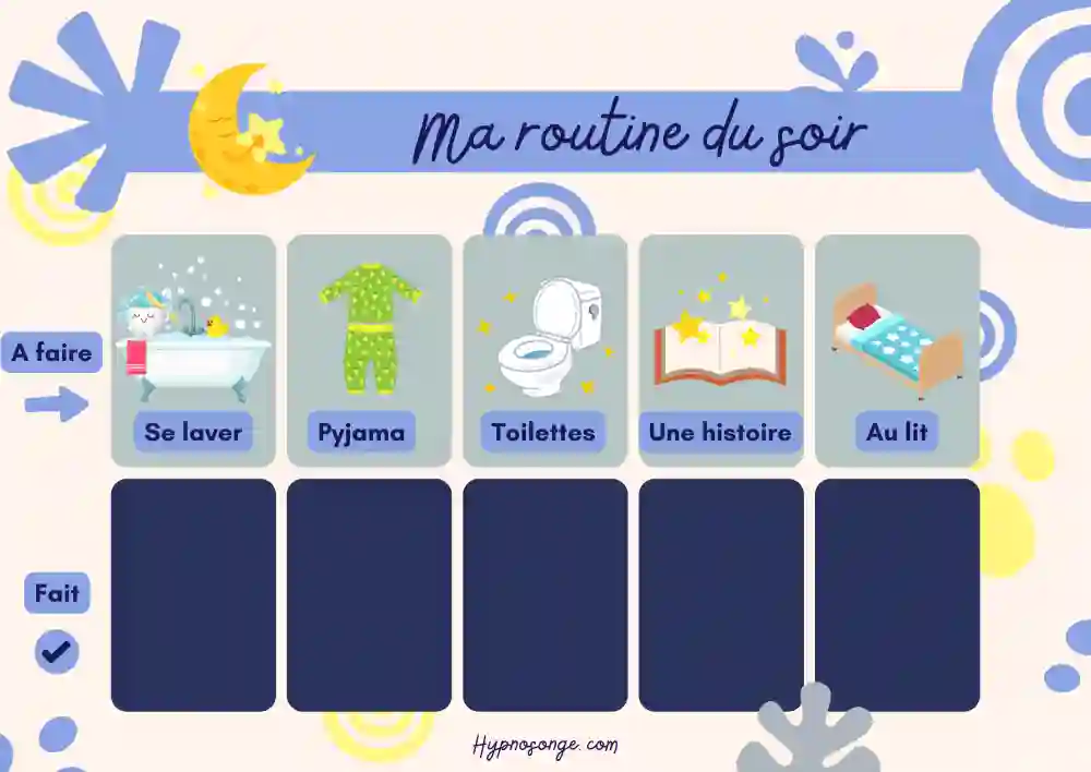 1 affiche « Ma routine du soir » + 1 affiche vierge afin de pouvoir la personnaliser à votre quotidien,