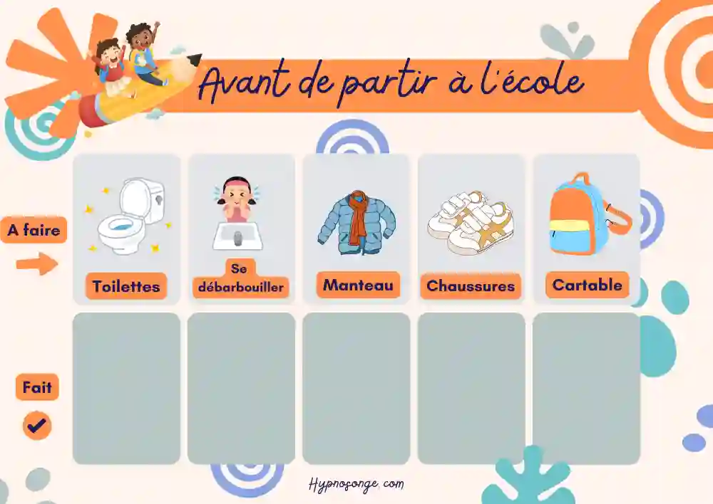 1 affiche « Avant de partir à l’école » + 1 affiche vierge afin de pouvoir la personnaliser à votre quotidien,
