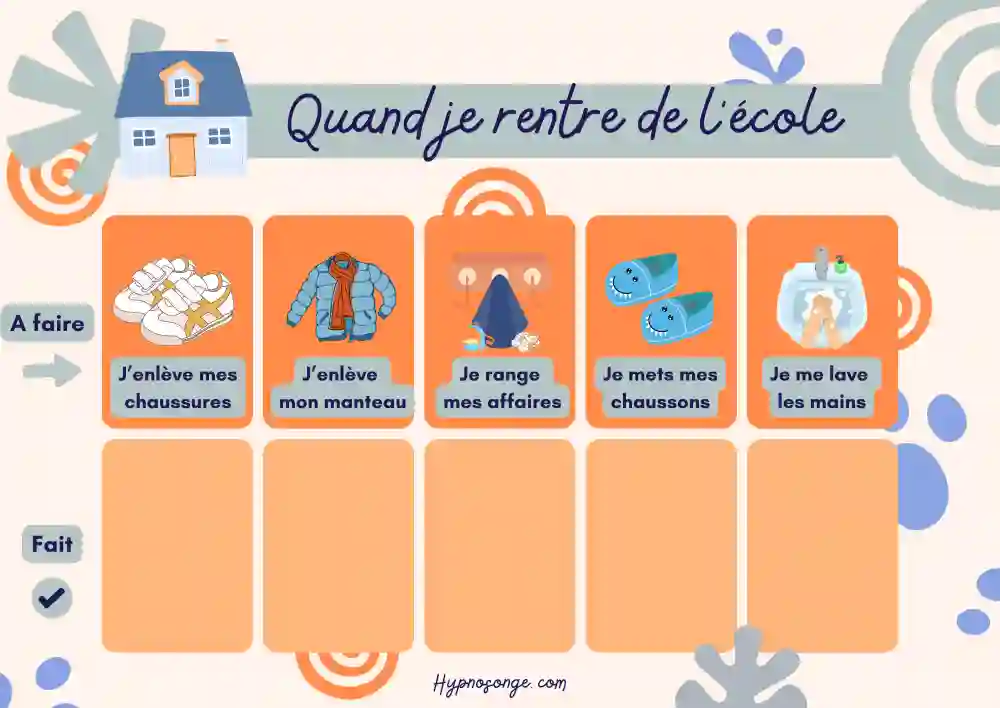 1 affiche « Quand je rentre de l’école » + 1 affiche vierge afin de pouvoir la personnaliser à votre quotidien,
